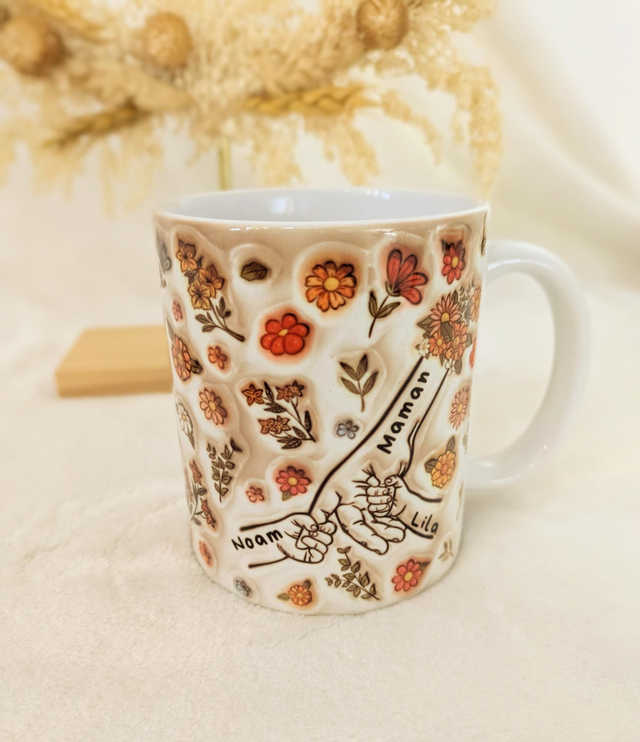 Offrez un cadeau rempli d’émotion avec cette superbe tasse personnalisée, décorée de jolis motifs floraux chaleureux et d’un dessin symbolisant l’amour fort entre une maman et ses enfants.