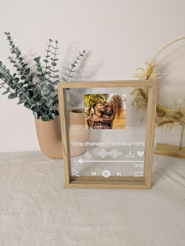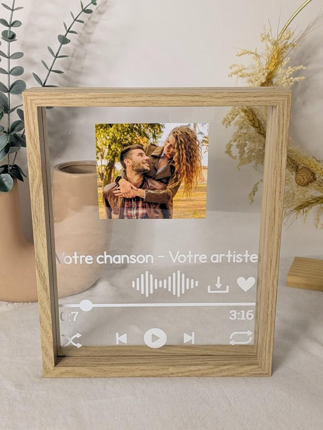 Ce cadre élégant met en valeur une photo de vous deux, accompagnée du titre de votre chanson préférée et du nom de l'artiste, le tout présenté dans un design inspiré de l'interface d'un lecteur de musique.